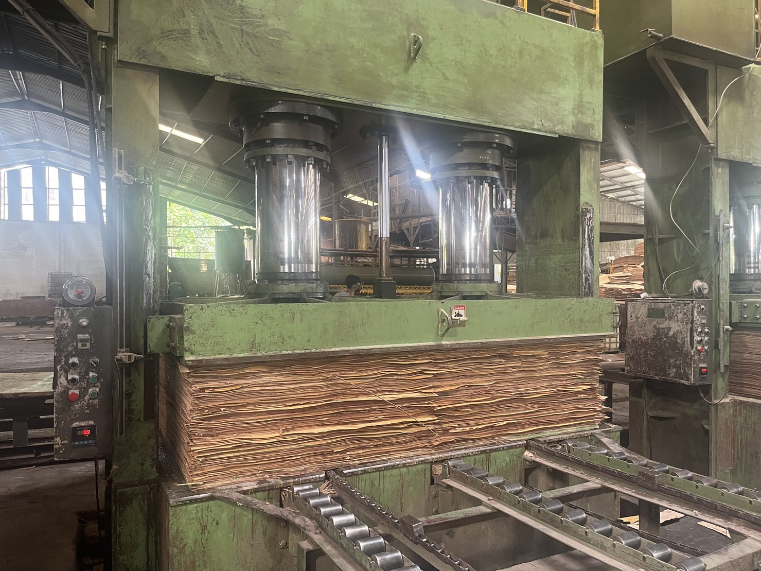 PT. Timberland use 1200 tons hot press that is make sure glue coating and flatness.
