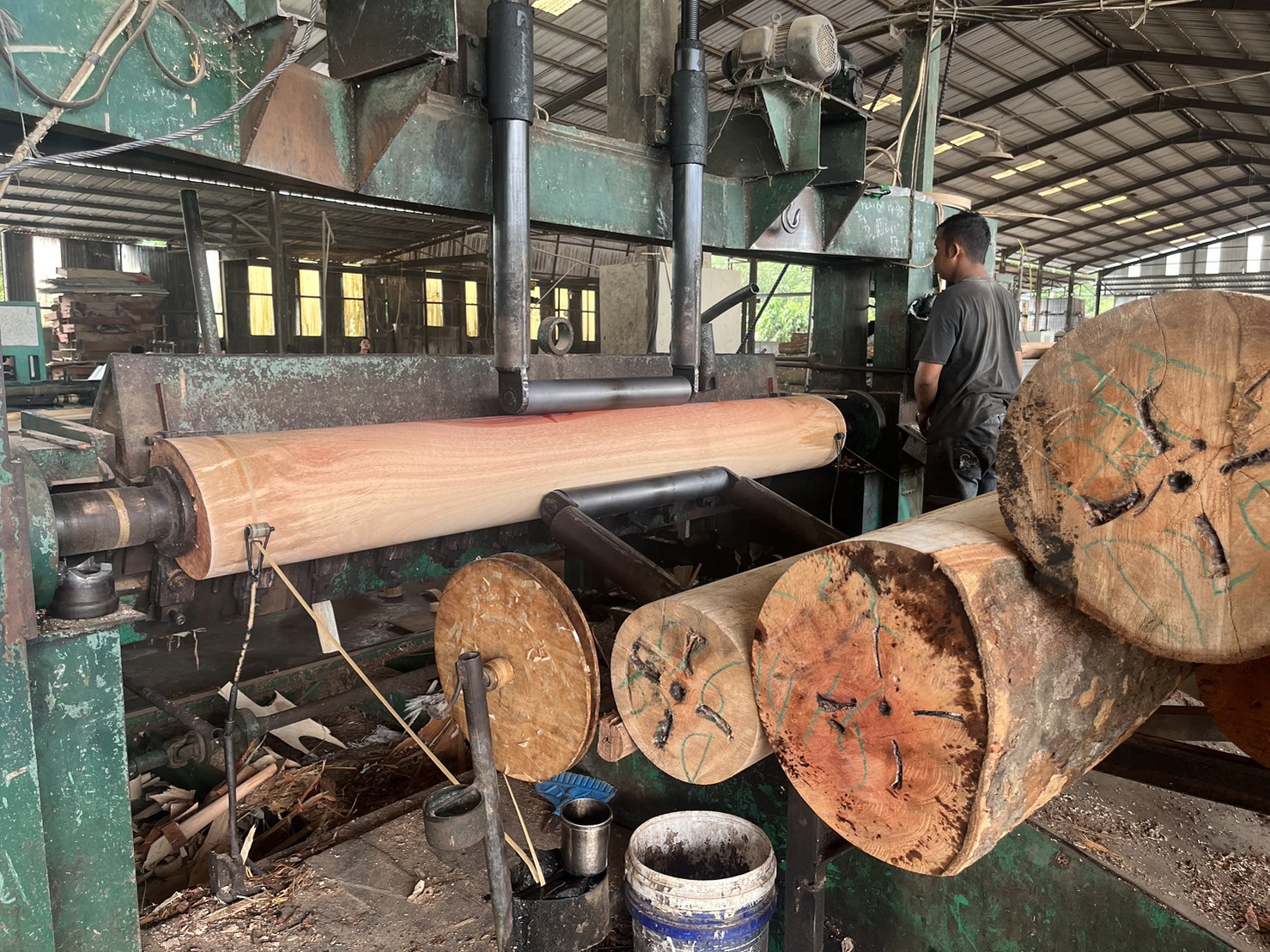 Veneer rotary peeling Veneer rotary peeling lathe is an industrial machine that is used to peel thin sheets of wood veneer from a log.